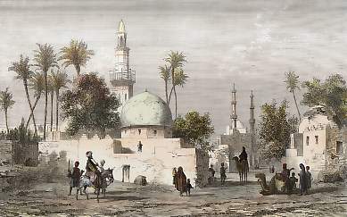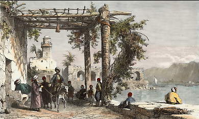 Egypt. Original wood engraving drawn by K. Girardet, engraved by J. Quartlev. 1860. Good condition. Hand-coloured. 14,5x9,5cm. Matted.