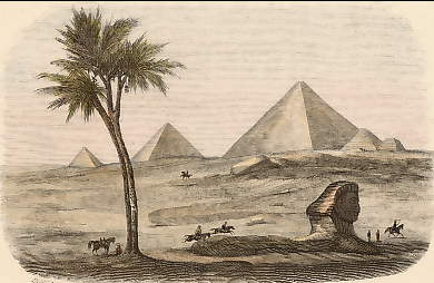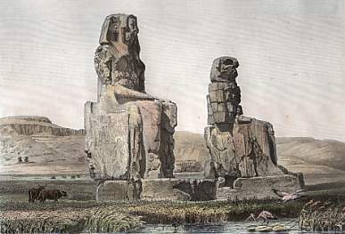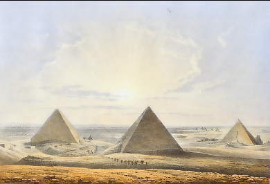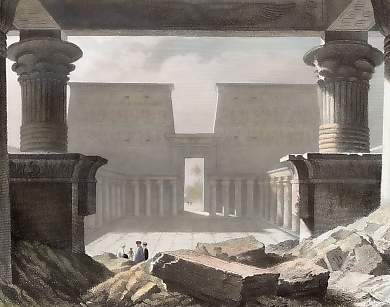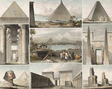 1. Pyramid in Lake Moeris, 2. Pyramids of Gizeh, 3. Section of a Pyramid at Memphis, 4. Pyramid at Assur in Nubia, 5. Colossi at Thebes, 6. The Sphinx of Gizeh, 7. Hall of the Palace at Carnak, 8. Entrance into the Palace at Luxor, 9. Propylaea on the Island of Philae.