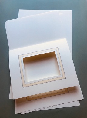Marie-Louise en carton sans acide de couleur crème avec un filet ocre et brun. Taille de la Marie-Louise: 24x30cm. Taille de la fenêtre: 12x17cm.