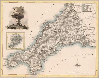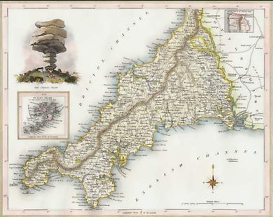 England. Original map on steel drawn and engraved by R. R Davies. 1832. Insert: Scilly Isles. Coloured cartouche: The Cheese Wring. Hand coloured. Very good condition. Hand-coloured. 23,5x18,5cm. Matted.