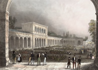 Der Rakoczy-Brunnen und der Arkaden-Bau in Kissingen