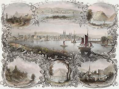 Germany. Original multi-view engraving on steel drawn and engraved by A. Carse. 1853. Very good condition. Hand-coloured. 18x14cm. Mounted.