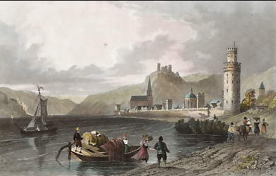 Germany. Original aquatint by J. J. Tanner. Librairie de L.J Kirchberger à Ems. Rare. Decorative border. 1850. Good condition. Hand-coloured. 14x9cm. Matted.