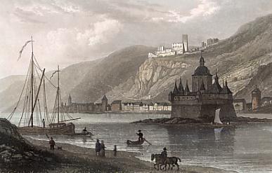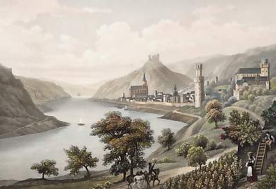 Germany. Original aquatint by J. J. Tanner. Librairie de L.J Kirchberger à Ems. Scarce. Decorative border. 1850. Good condition. Hand-coloured. 14x9,4cm. Matted.