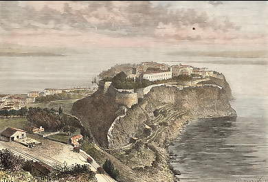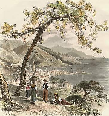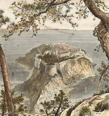 Monaco. Gravure sur bois par H. Fenn. 1881. In-texte, imprimée au verso. Très bon état. Aquarellée à la main. 17,5x16cm. Montée sous passe-partout.