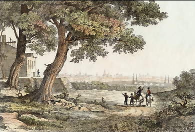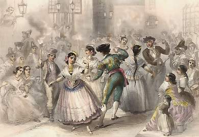 Espagne. Gravure sur bois, gravée par J. W. Parker d´après W. Heath. 1835. Traces de texte. Texte au verso. Aquarellée à la main. 21x14,5cm. Montée sous passe-partout.