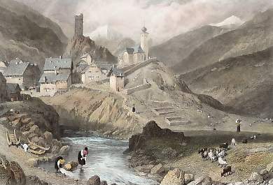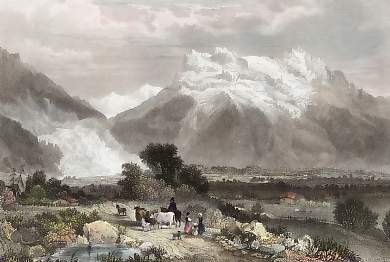 Switzerland. Original steel engraving drawn by W. H. Bartlett, engraved by D. Buckle. 1836. Good condition. Modern hand-colouring. 17,5x11,5cm. Matted.