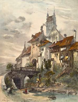 Suisse. Gravure sur bois, gravée par J. L. Trambauer d´après E. T. Compton. 1879. Bon état. Aquarellage ancien. 24,5x16cm. Montée sous passe-partout.