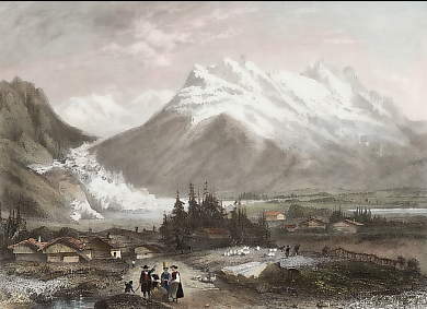 Switzerland. Original steel engraving drawn by W. H. Bartlett, engraved by R. Wallis. 1836. Good condition. Hand-coloured. 17,5x10,5cm. Mounted.