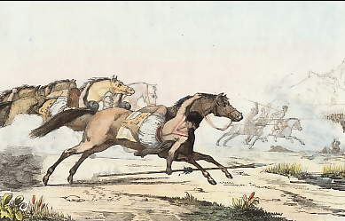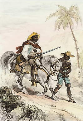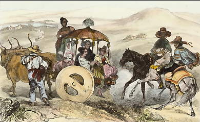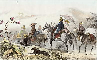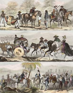 Brésil. Gravure sur acier, gravée par H. Winkles d´après G. Heck. 1849. Sans titre. Très bon état. Aquarellée à la main. 25x19,5cm. Montée sous passe-partout. 1. Travelling farmer from the Rio Grande, 2. Traveller from the province of Minas, 3. Brazilian planter´s family driving to mass, 4. Townsmen from the Brazilian Rio Grande Travelling, 5. Caravan of Brazilian merchants, 6. Convoy of diamonds.