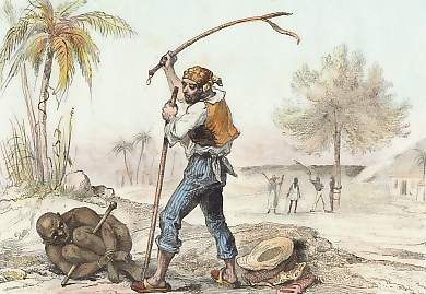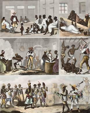 Brésil. Gravure sur acier, gravée par H. Winkles d´après G. Heck. 1849. Sans titre. Très bon état. Aquarellée à la main. 25x19,5cm. Montée sous passe-partout. 1. A slave trader, 2. The punishment of the stocks, 3. Negroes employed in the preparation of manioc flour, 4. The scourge, 5. others, as porters, 6. and others again returning from hunting.