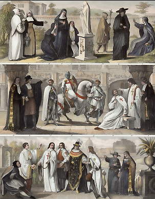 1.Visitantine Nun in Flanders, 2. Nun of Notre-Dame, 3. Nun of Notre Dame de la Misericorde, 4. Priest of the Congregation of Missions, 5. Sister of Charity of St. Vincent de Paul, 6. Hospital Nun of La Fleche, 7a. Trappist Monk, 7b. Poor Volunteer Monk of Flanders, 8. Grand Master of the Order of Malta, 9. Grand Cross of the same, 10. Knight of Malta, 11. Lady of the Order of St. John of Jerusalem, 12. Templar in House Dress, 13. Templar in War Costume, 14.Templar in full Armor Mounted, 15. Grand Master of the German Knights, 16. Knight of St. James of the Sword, 17. Knight of the Order of Calatrava, 18. Knight of the Order of Alcantara, 19. Knight of St. Avis in Portugal, 20. Knight of St. Stephen, 21. Knight of the Holy Ghost, 22. Hospitaller of the Holy Ghost, 23. Religious of the Order d'Aubrac.