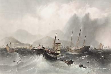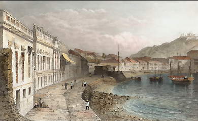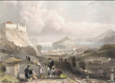 Macao. Original steel engraving drawn by T. Allom, engraved by S. Fisher. 1843. Very good condition. Hand-coloured. 18,5x12,5cm. Matted.