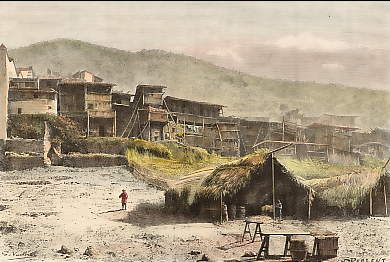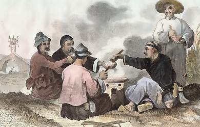 China. Original wood engraving, engraved by A. Kohl after E. Ronjat. 1882. Foxing in the margins. Hand-coloured. 19x13cm. Matted.