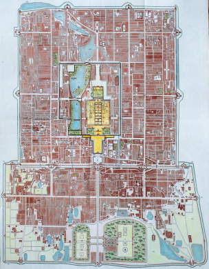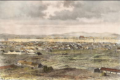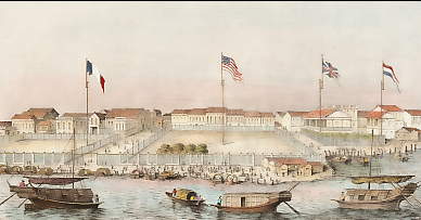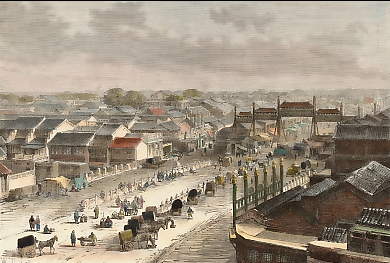 China. Original city map on steel. 1853. Very good condition, narrow left margin. Hand-coloured. 31,5x24cm. Matted.