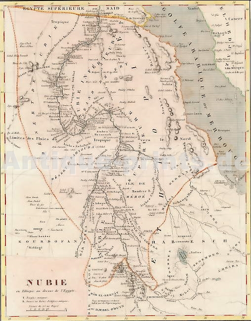 Ethiopia. Original map on steel. Paris, 1846. Very good condition. Hand-coloured. 17,5x10,5cm. Matted.