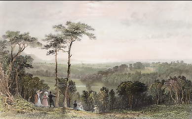 England. Original steel engraving, engraved by E. Finden after W. Westall. 1830. Very good condition. Hand-coloured. 14,5x9,5cm. Matted.