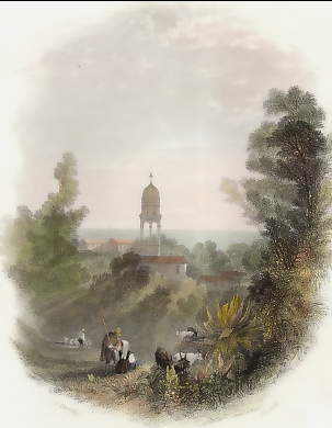 Greece. Original steel engraving drawn by W, Brockedon, after a sketch by J. Arundel, engraved by E. Finden. 1836. Good condition. Modern hand-colouring. 14x9,5cm. Matted.