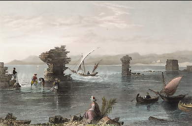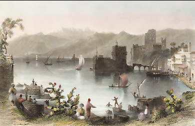 Lebanon. Original steel engraving, engraved by E. Finden after J. M. W. Turner. 1852. Very good condition. Hand-coloured. 14x9,5cm. Matted.