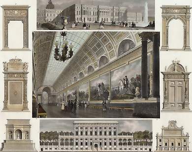 Paris. Original steel engraving engraved by E. Krausse after G. Heck. 1849. No title on the plate. Very good condition. Hand-coloured. 25x20cm. Matted. 1. The Triumphal Arch in Paris, 2-3. The Paris Observatory, 4. The Theater at Dresden, 5-6. The Theater in St Petersburg, 7. St CharlesTheater in New Orleans, 8. The Custom House in New York, 9. Plan of the Palazzo del Te in Mantua, 10-12. Casino in Liège, 13. The Museum in Cassel, 14. Old Exchange in Amsterdam, 15ab. Plans of Caravansaries, 16ab-17. Watchhouses, 18. Plan of the Prison in Aix.