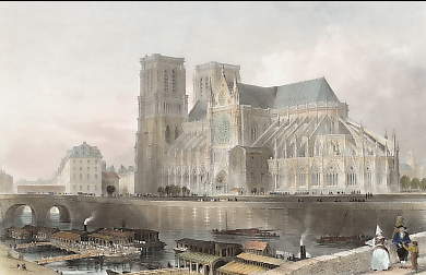Paris. Steel engraving "from original drawings taken under the direction of A. Pugin, the engraving executed under the superintendence of C. Heath". 1829. Good condition. No title under the plate. Hand-coloured. 14x8,5cm. Matted