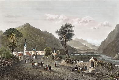 Switzerland. Original steel engraving drawn by W. H. Bartlett, engraved by R. Wallis. 1836. Very good condition. Modern hand-colouring. 17x11cm. Matted.