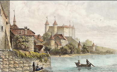 Switzerland. Original steel engraving drawn by Girard, engraved by Roca. 1858. Very good condition. Hand-coloured. 16,5x11,5cm. Matted.