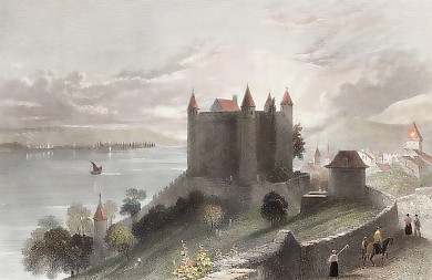 Switzerland. Original steel engraving, engraved by H. Winkles after W. Tombleson. 1832. Good condition. Hand-coloured. 15x10cm. Matted.