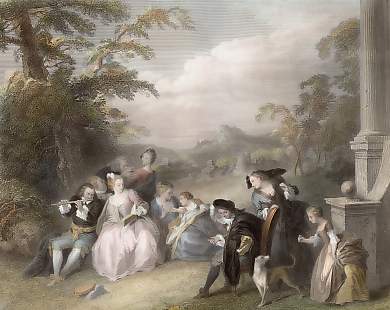 Genre. Original steel engraving engraved by W. French after N. Lancret. ca 1850. Very good condition. Hand-coloured. 17x13cm. Matted.